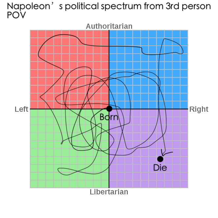 Napoleon didn’t have any political ideologies, which is rare as a succeeded politician. When he was young, he supported French Revolution because they said they will give Corsica independence. He had a relationship with Pasquale Paoli, who was an influencer of Corsica independent. A few sources even narrated Napoleon had declared that “only the belt belongs to France, the sword is mine”. However, after the Bonaparte family started to have a conflict with Pasquale Paoli, he became more and more allegiant to France. Which shows that Napoleon is Opportunism. If he is not opportunism, he would stick with his standpoint and fight for the independent.